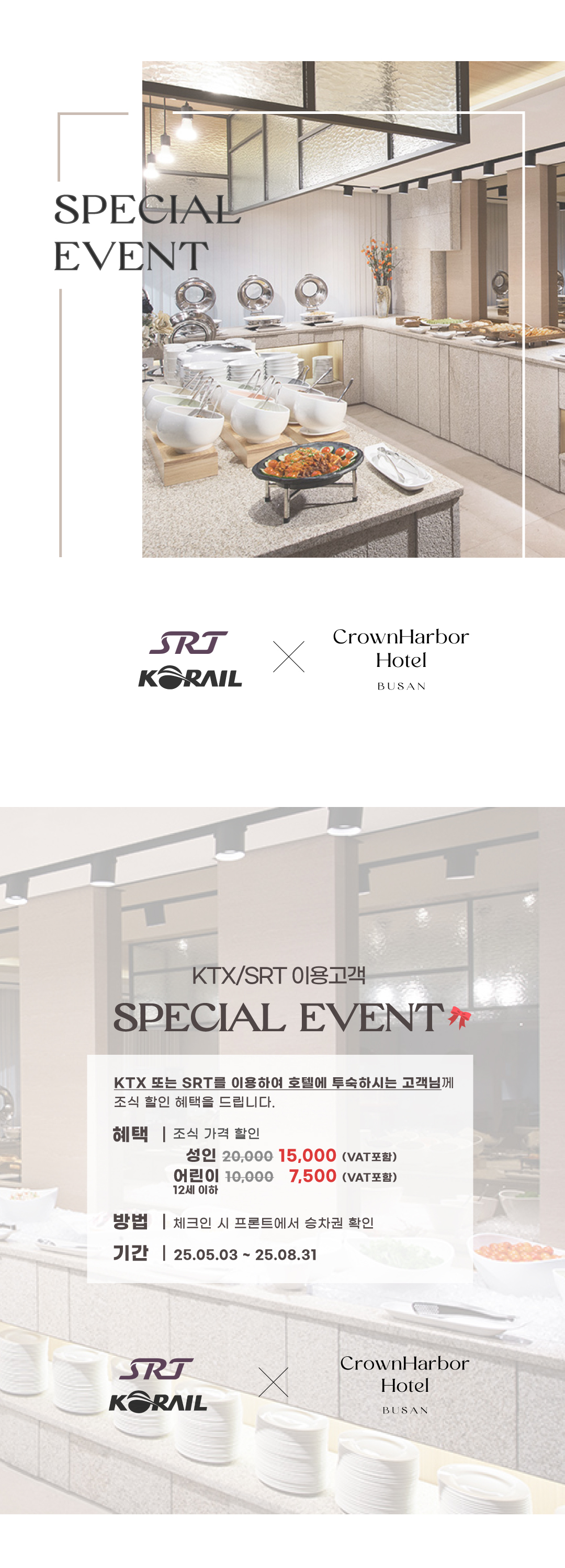 SPECIAL EVENTKTX 또는 SRT를 이용하여 호텔에 투숙하시는 고객님께 조식 할인 혜택을 드립니다.